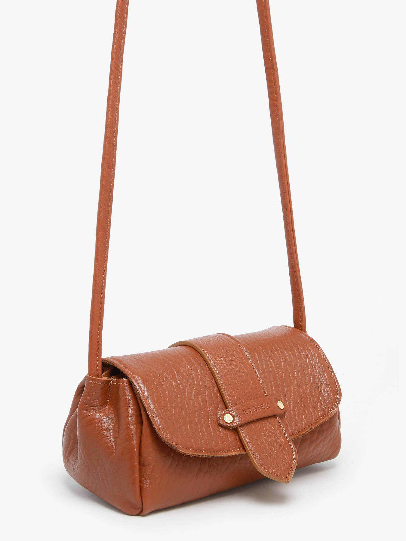 Le sac porté bandoulière AGNES par ETRIER est conçu en cuir de mouton crispé français. Ce modèle est présenté ici en taille S et se ferme par un rabat doté d'un bouton-pression aimanté. Il existe également en taille M pour celles et ceux qui souhaitent une contenance plus généreuse. Le sac est agrémenté d'une languette réversible, avec une face dorée et une face en cuir assortie au reste du sac. Elle se fixe facilement grâce à deux boutons de col et se glisse dans une poche arrière prévue à cet effet.